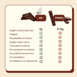 80% less sugar than comparable chocolate bars (unrefined date sugar). Completely clean and short ingredient list. Recyclable paper sachet, traceable cacao, vegan, certified organic, hand-made in France.