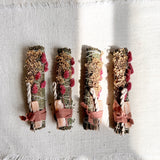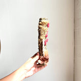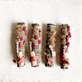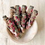A large, 8 inch bundle of ethically sourced california cedar, wrapped up with broom bloom, phalaris grass, Nepalese rope incense, and pink selenite, wrapped up in vintage string and ribbon. The bundles are assembled, by hand in the Rochester, NY studio. All of the sting and ribbon is purchased at a local non profit shop that sells vintage and dead stock sewing materials. proceeds go back to the community, providing sewing and textile based classes, as well as job training.