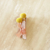 A palo santo bundle with two yellow craspedia and a pink selenite stick wrapped up with vintage fabric.