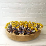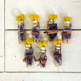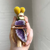 The Sunday Morning Palo Santo Bundle is comprised of a dried white rose, two stems of craspedia and a unique rough amethyst piece on two ethically sourced palo santo sticks, wrapped using ribbon that is purchased from a local non-profit which sells vintage and deadstock sewing and crafting materials, where proceeds go back to the community, providing sewing and textile-based classes, as well as job training.